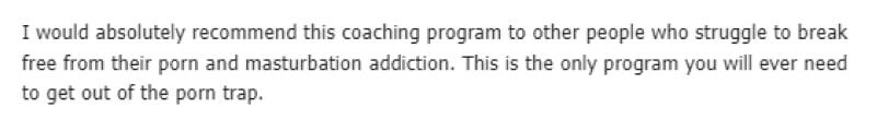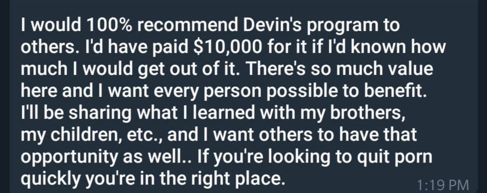 Why do they say things like that?Because this isn’t just a “quit porn program”.In addition to freeing you completely from porn…You’ll start to live a life of excellence.On your own terms.Quite frankly, can you put a price tag on your goals and dreams?We’re talking about all the time and the life you’ve lost.And all the opportunities you have missed by being hooked on porn.That said, we can't go back in time…But when you start to live your new life (a great life that you didn't think was possible)…You won't want to turn back time.The only thing you'll want is to have gone through my program sooner.