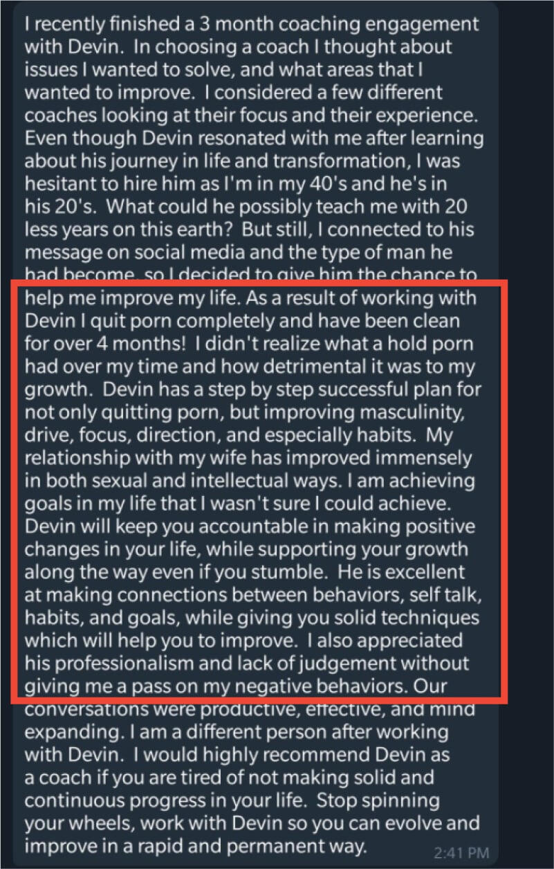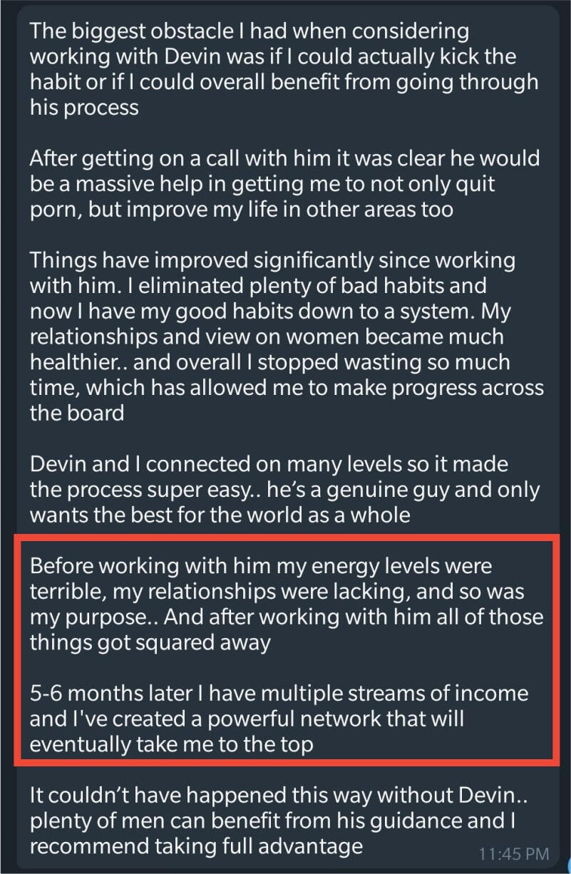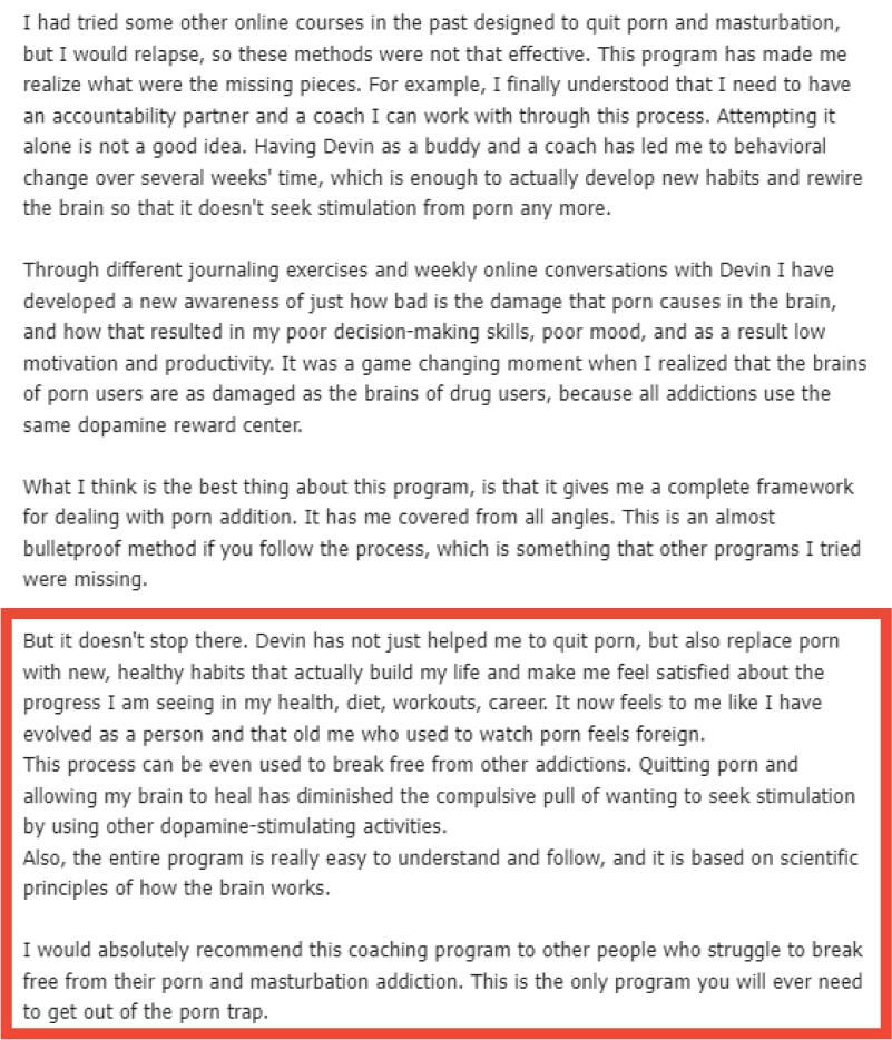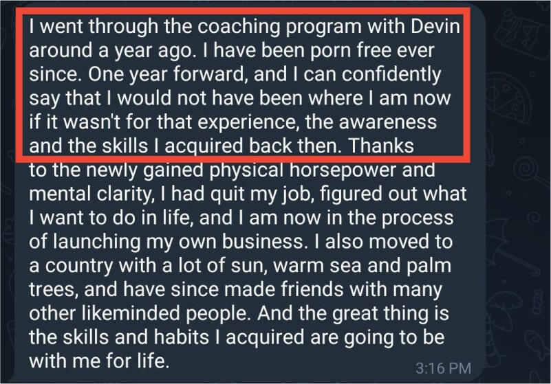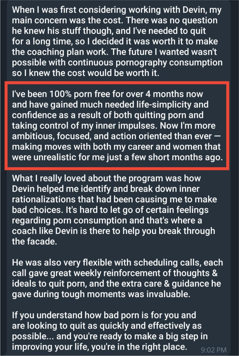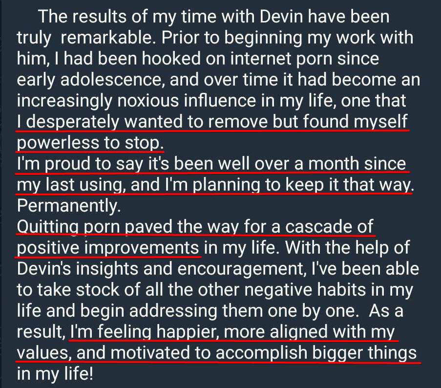 In this short article, you’ll see how you can finally quit porn forever and start to live an amazing life in 60 days or less.No matter how many times you've tried to quit porn before.Or if you feel hopeless and think you can't.It’s something that can be explained with an almond... (You’ll understand why in just a moment).Read this quick essay until the end so you don’t miss all the insights.And don't worry, I get it, I know the internet is full of crazy promises and BS.I’ve been in your position, and I know how it feels.My name is Devin McDermott.And I invented a bulletproof system that helps any man kick porn out of his life for good.(Just take a look at these screenshots).