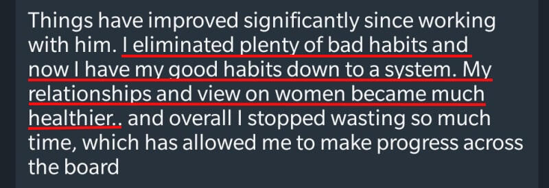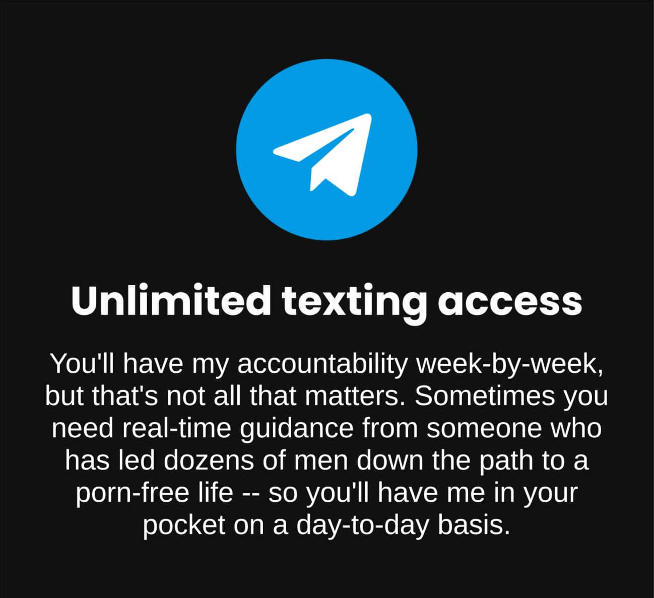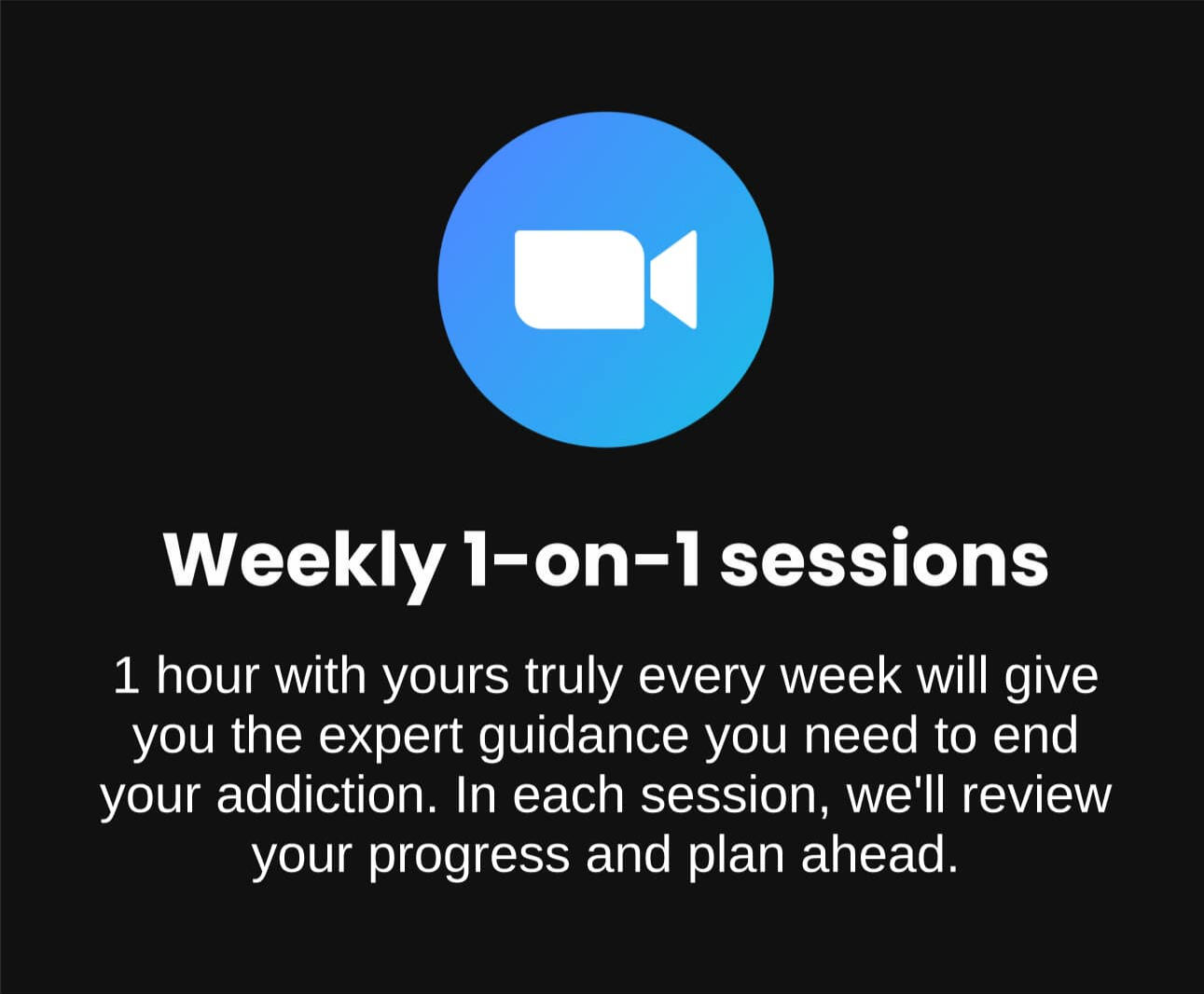 The only proven quit porn system that allows you to finally and permanently quit porn and achieve a personal transformation…So you can start living the life you've always wanted in 60 days or less.It’s a personalized reprogramming process.Which means I’ll be with you along the way... working directly with you to create a permanent change in your life.Think of me as your personal trainer.As you know, even the best athletes in the world have a coach.LeBron James, Conor McGregor, Cristiano Ronaldo.Every single goat has a trainer, and there's a reason for that.When you need fast, reliable, and accurate results…You have to work 1-on-1 with an expert, and that's what I'm here for.We’ll work in weekly sessions.And you’ll get unlimited direct access to me (more on that in a bit).