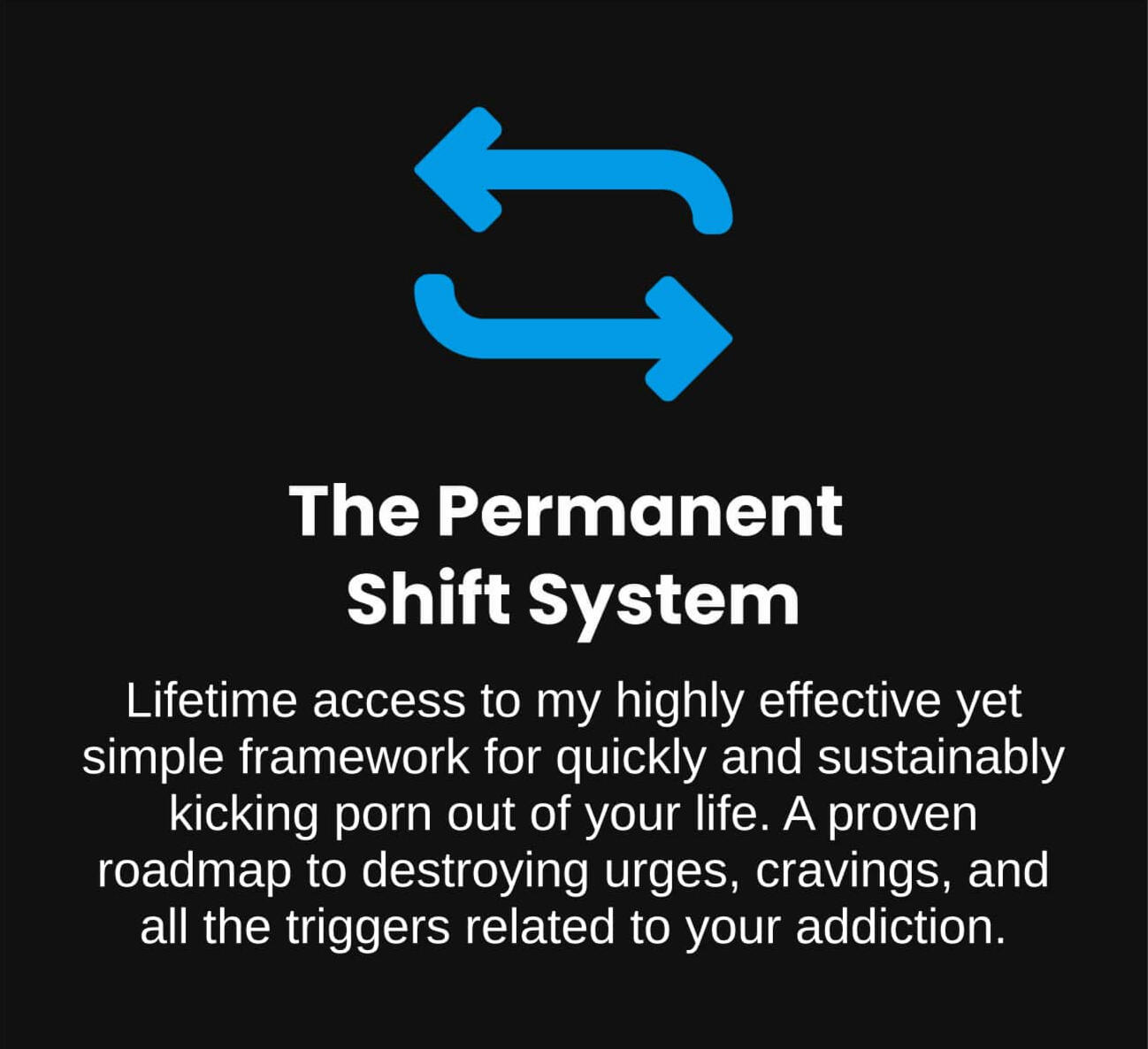 Listen, while other methods rely on pure willpower, trackers, blockers...And make you waste a huge amount of time and energy on useless things.We go deeper and rely on strategies and systems so you barely need any willpower at all...Take for example the fourth pillar of the Permanent Shift System:Brain Retraining.It’s about rewiring your emotional brain (the little almond that keeps you hooked).The thing is, the emotional brain doesn’t understand your words.Remember, it’s a lizard.You can scream to your emotional brain all day long:“Hey, dude, let’s quit this porn thing”.But he simply doesn’t know what you’re saying and frankly doesn’t care.Have you tried to negotiate with a wild lizard or a primitive animal? Good luck.So instead of repeating mantras and phrases…We use specially designed exercises.They work on the emotional brain like video game cheat codes.This gives you access to features you didn't even know existed.And puts you back in control of the situation.With these strategies, it's easy to stop your urges.And you'll wonder why you struggled for so long before.(Simple, no one else is teaching these strategies).