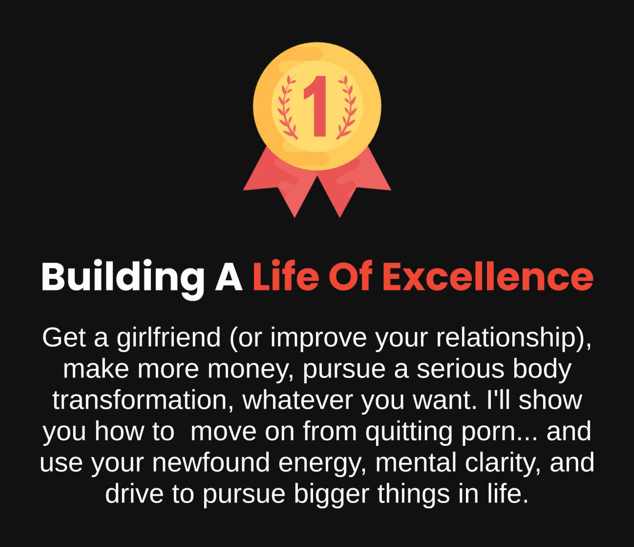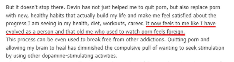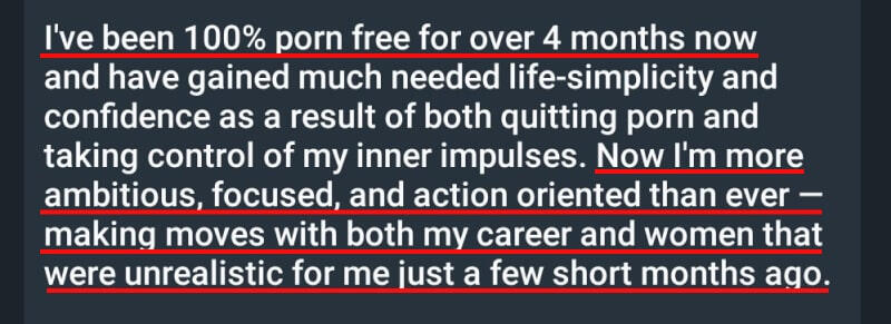 This point is crucial.And it makes Strategy Over Willpower System so different from all the things you’ve tried before.You may have noticed this:Do you know what they talk about in all the quitting porn support groups?Yes, they only talk about quitting porn... and mostly, relapsing.Do you know what their success rate is like?Exactly, it's absurdly low.And a lot of people giving advice are still hooked on it...Do you see the pattern?The truth is, quitting porn isn’t just about quitting porn.It’s about building a life that you don’t want to escape from anymore.Because that’s what porn is, an escape from negative emotions.But here it's not just about starting new hobbies and trying new things.(You've heard that advice a lot, and you’re still trapped).Instead, I’ll help you to achieve great things and build an amazing life.What kind of great things and what kind of great life simply depends on what you want.Do you want a girlfriend?Or do you want to improve your current relationship?Maybe you want to have a profitable business?Or transform your body.Literally, anything you want to achieve.Of course, we start to make up for the time you've lost (yes, porn steals time).And building a life so fantastic that when you look back a year from now...You can't recognize your past self.You'll say, “Was that me?”And no, that was the version of you that was hooked on porn.