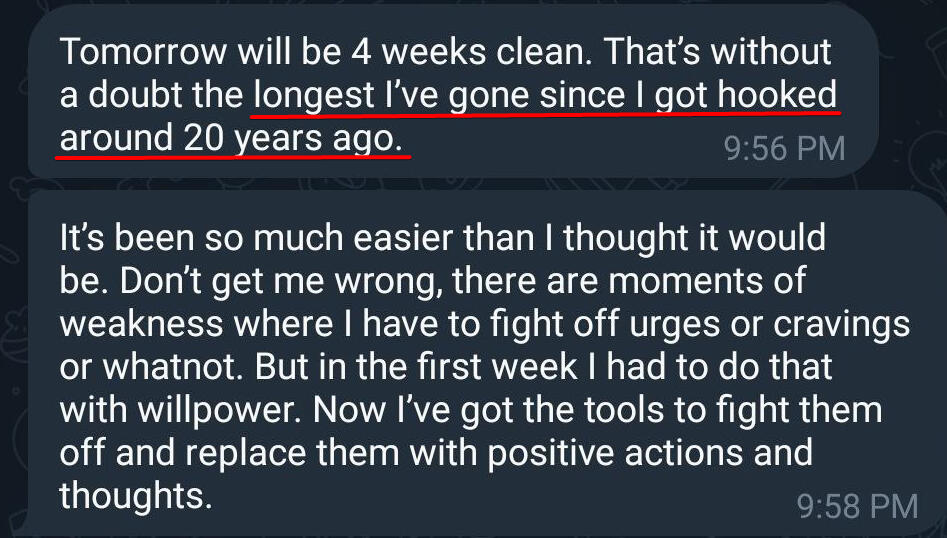 That’s what it takes to quit porn forever.Just one proven system.❌ You don’t have to waste time on any internet forum.❌ Or listening to a "specialist" who knows nothing about porn addiction.❌ Or following advice from people who are trapped in porn too.This is a common, well-intended but dangerous trap.It’s like a group of blindfolded guys guiding each other in the dark.Do you see how something doesn’t fit?But with a reliable system, there are no doubts.If there’s a section of the path that’s a little dark, I’ll guide you by the hand and you'll always know where the next step is.If you feel an urge or a little anxiety or anything, we’ll handle it together.(Remember, you get unlimited access to me via text.)No, with my system you never rely on your willpower.This is a proven solution, not a medieval torture method.So, it doesn’t matter how little willpower you think you have.