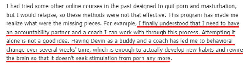 Do you really want to quit porn once for all?Well, this system works for all men who want to quit porn.That’s a fact.If you really want to quit, you'll put in the small amount of effort necessary to make the system work.If you want to know if there’s something like a refund policy…Well, let me tell you.There is a 2 week satisfaction guarantee... but you won’t need it.And if you want to know what we’re going to do to help you with your specific case, contact me via Twitter @devinmcdermot
